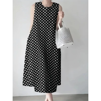 水玉模様のクルーネックドレス、春夏向けのカジュアルなノースリーブのゆったりしたドレス、レディース服