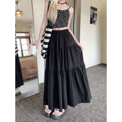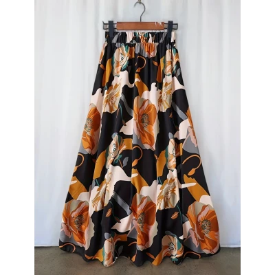 2025年新作 女性用フローラルプリントAラインミディスカート - ハイウエストフレアドビーチスカート、プリーツ裾付き、ブラック&ベージュ 夏のカジュアルからフォーマルウェアまで、オフィス&パーティーに適した万能スカート、キュートでエレガントなデザイン