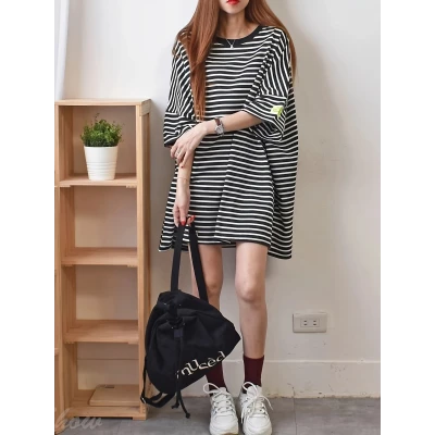 レディース プラスサイズ ストライプ オーバーサイズTシャツ カジュアル 夏用 ミドル丈 ハーフスリーブ ブラック&ホワイト 縦ストライプ ルーズフィット