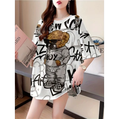 キャラクタープリントの女性用プラスサイズカジュアルTシャツ - ルーズフィット、ショートスリーブ、ラウンドネック、軽量で伸縮性のある素材、春/夏のファッション、カジュアルウェア|プレイフルプリントトップ|快適なフィット、プラスサイズ